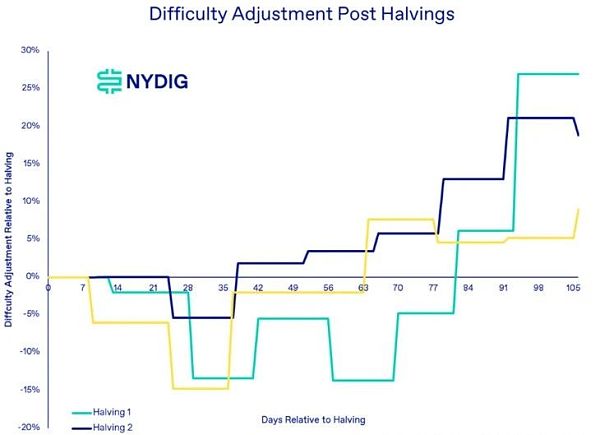 然而,NYDIG对本次减半的预测是,哈希率很少(如果出现)会在减半后离线,因为一些最古老的矿机在当前的价格水平仍然可实现盈利。以往的减半,难度向下调整的峰值分别为13.7%、5.4%和14.7%。