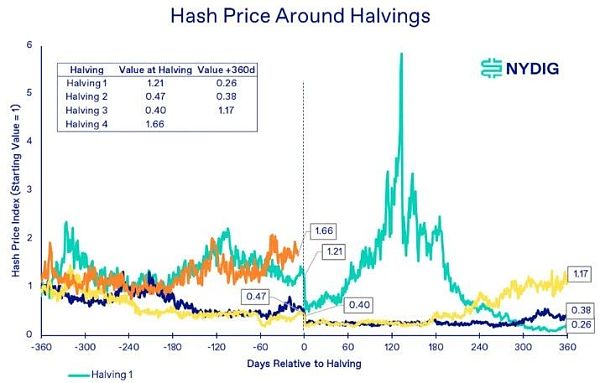 哈希值(称为哈希价格)是矿工的关键因素,受区块奖励和交易费用的影响,减半前后会有显著的变化。在某些情况下,例如当前的减半,哈希价格在减半发生前飙升,而在其他情况下,则下降。通常情况下,减半后,哈希价格会下降约 50%,具体取决于费用对矿工收入的贡献。然而事实证明,减半后360天的结果是不可预测的,有些情况显示较初始水平有所增加,而有些情况则在大幅上涨后出现显著下跌。