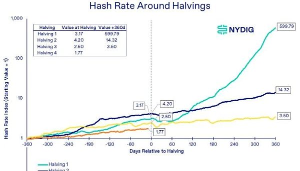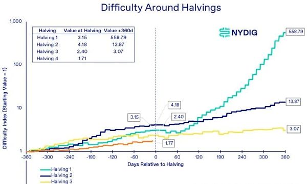 虽然减半刚开始后难度可能会有所下降,但总体趋势显示,减半后的360天难度水平会大幅上升。这凸显了比特币网络应对挖矿活动变化的弹性和适应性。