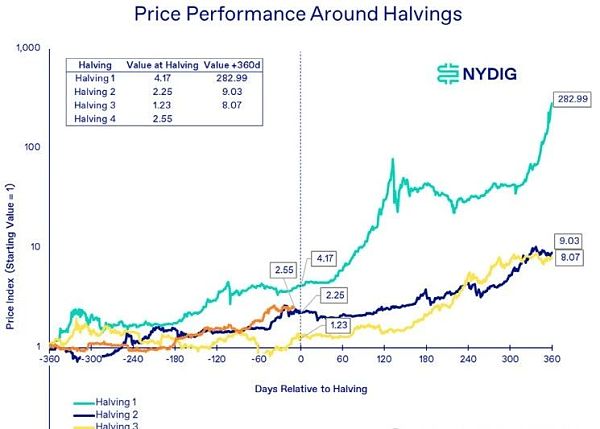 虽然比特币在之前的减半中表现出强劲的势头,但在减半后的360天里出现了更大的增长。以往3次减半后的涨幅分别为2,819%,803%和707%。这次减半的一个有趣的区别是,比特币在减半之前达到了历史新高,这与过去的周期在减半后达到新高不同。