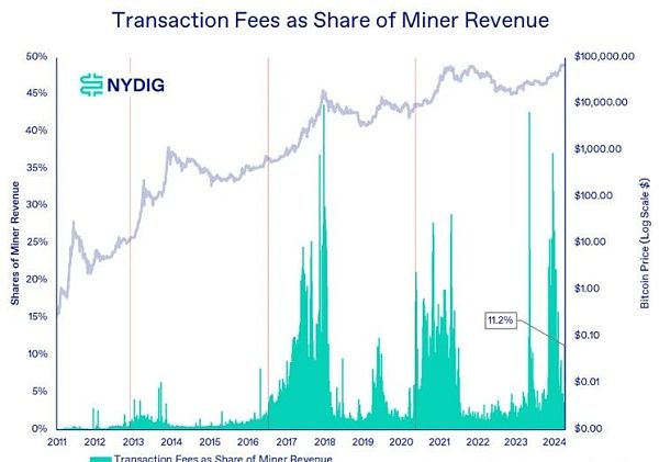 纵观比特币的历史,矿工的收入主要源于区块补贴,而不是交易费。自推出以来,区块补贴占矿工收入的98.5%,其中只有1.5%来自交易费。交易费用的重要性一直在上升,特别是随着Ordinals和铭文的引入。今年3月,交易费占矿工收入的5%左右(最近这一数字跃升至11.2%)。在最近的一些区块中,交易费用甚至超过了区块补贴。尽管发生了这种转变,但矿工仍然严重依赖区块补贴,因此对矿工来说,减半是一件大事。随着减半后区块补贴减少,矿工将越来越依赖交易费来获得收入。