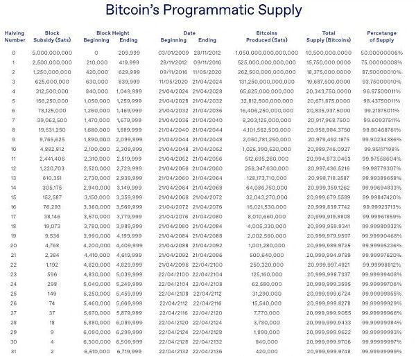 减半是比特币供应量固定的基础,将总供应量限制在(接近)2100万枚。
