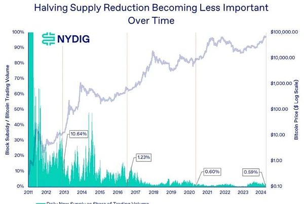 鉴于投资者可获得的新供应减少,围绕减半事件的一个普遍观点是对价格的积极影响。听起来确实如此,因为比特币的每日供应量预计在4月20日减少450个,按7万美元/比特币的价格计算,每天的供应量约为3150万美元。然而,从全球交易量来看,这一降幅仅占日交易量的59个基点(约0.6%),一比例相对较小。值得注意的是,这一比例在过去要高得多,并可能会对交易量和价格产生更大的影响。例如第一次减半供应量约减少了交易量的10.64%,与目前的情况相比,影响更为明显。NYDIG认为,与供应相比,需求方面,特别是与现货ETF相关的需求方面,将在决定价格方面发挥更关键的作用。
