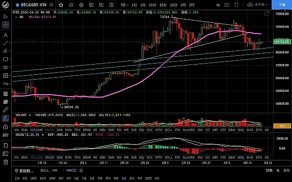 大饼昨日走势与思路一致,早间下跌形成底部随后直接拉升,最高触及65400附近受阻回落,恭喜跟上的朋友获利五千点,目前币价在63780附近运行,四小时级别行情反弹后受阻连阴回落,但力度不大,下方有ma14支撑反弹,回踩空间有限,加上周末本身波动就不会太大,短期走势以震荡为主,日线来看k线直接阴转阳收长下影,可见多头支撑比较强烈,若能站稳64500上方下个位置关注66800,目前仍处于牛市中,只是加长了震荡周期,拿好手中的筹码逢低加仓长线坚定看涨,上方压制64500-65500,下方支撑63000-61800