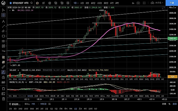 以太坊昨日走势与大饼一致,白盘连阳拉升,最高至3130附近受阻回落,恭喜跟上低多思路的朋友获利一百余点,目前币价在3060附近运行,四小时级别行情仍处于区间震荡,上方压制在3130附近,虽受阻回落但力度较弱,预计延续的概率不大,目前走势缓慢波动不大尽量多看少动,不过跌破新低可能性很小,日线来看整体处于底部震荡,上方受ma90压制,若能突破下个位置关注3220附近,目前继续持币观望,等待周一开盘,若再次给到二开头的以太坊,可以分批买入,上方压制3100-3200,下方支撑3000-2900
