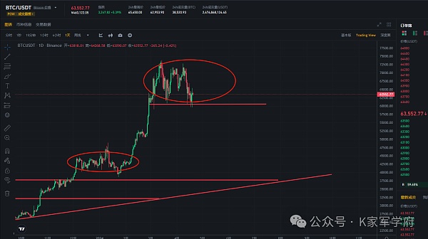 这日线级别就好像今年2月份那段时间的行情类似,当时震荡一段时间之后直接起飞,只是当时的价格比较低,所以振幅看起来比较小,但是现在的价格就高将近一倍了,所以振幅自然而然的看起来就比较大,这轮起来对上半年就是一个最后一个阶段的起飞,然后出现高点,等待腰斩再次进场,埋伏至明年上半年结束行情,目前日线级别上我们能看到的就是60000的关口多次进行试探插针,但是还是防守住了,行情多次在这个位置进行一个反弹,昨天更是收线金针小阳线,那么就证明这波的行情已经开始,这轮行情关注的几个点位68000点一线72000的关键点位,这个72000是前期多次冲击失败没有强势去站稳的一个位置节点,后续的行情中只有突破这个位置并去站稳的情况下那么可以直接打开后续的上方空间,第一目标点位可以看到76000-80000区间值,第二目标就是96000-100000关口一线的位置,后续就是12-15万美金区间,当然这是最终的看点,行情也是要一步步的走出来,不是一次性就到位的,我认为后面市场再怎么疯狂,都不会超过15万美金。