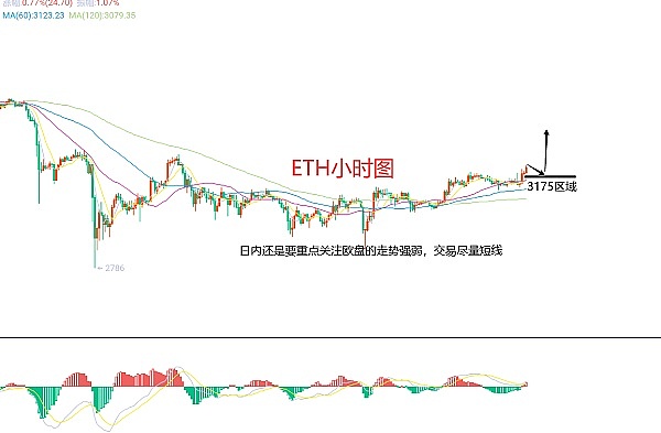 4月22日以太坊(ETH)合约技术面分析:今日方面,大周期日线级别昨日报收小阳线,K线形态连阳上涨,价格在均线上方,附图指标死叉缩量运行,均线支撑位置3130区域附近,这样来说目前的日线级别走势还是比较强势的,但重点 还是要关注欧盘的走势方向,周末毕竟维持了震荡走势,今日早间冲高,要注意延续问题;短周期小时图午间起涨点3130区域附近,当前K线形态连阳,价格在均线上方,附图指标金叉运行,但不能直接多,周一还是要多看看,价格回归均线支撑3175区域,因此今日ETH短线合约交易策略:回撤3175区域多,止损3148区域,慕白哦看3235-3250区域