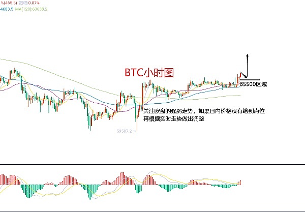 4月22日比特币(BTC)合约技术面分析:今日方面,大周期日线级别昨日报收小阳线,K线形态上连阳上涨,价格在缓慢上涨,附图指标死叉缩量运行,这样来说今日的走势大概率还是会围绕高点和低点区间震荡了,但这是预期,在交易时也还是要注意价格的破位走势风险,这是意识问题;短周期小时图昨日没有太大动作,今日早间支撑反弹午间向上强势突破前一日高点,当前K线形态连阳,附图指标金叉运行,但价格偏离了均线,还是要等回撤的,欧盘强弱时重点,因此今日BTC短线合约交易策略:回撤65500区域多,止损65150区域,目标看66300-66500区域;
