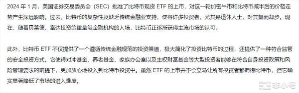 此外,在2024年1月,美国证券交易委员会(SEC)批准了比特币现货 ETF 的上市,对这一轮加密牛市和比特币减半后的价格走势产生深远影响。