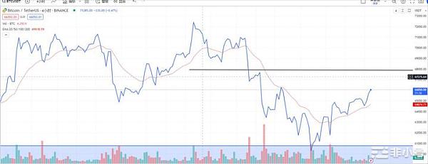 从4H图来看,如果在减半之前成功抄底的朋友,那么短线的第一止盈位置在图中黑色线的位置(大约67900附近),短线投机者获利可考虑减仓或清仓。