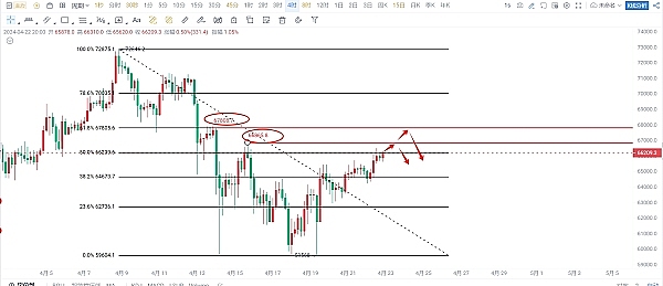 首先我们说一下今天盘面的一个思路,短期做多大方向做空,从消息面来看比特币减半那么坑定是利空的,但是目前牛市并没有结束,短期下调后期还是会有所拉伸,那么我们回到盘面,大周期周K的一个行情走势,从盘面中我们可以看到价格多次触及下方60000附近,且形成了很长的下影线后迅速的回升,可以看出目前比特币的买盘还是比较多,币友对后期的市场还是相当的认可,那么我们从日线角度来看,黄金分割线目前上方61.8%也就是67800附近存在压力,也是我们空单一个比较好的进场点位,但是按照目前行情的反弹力度,不一定能够达到,因为上方66800附近也存在小压力,那么我们可以轻仓先进场,选择分批入场
