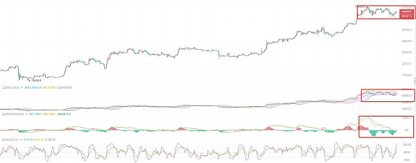 四小时K线四连阳突破趋势指标站上高位,EMA开始收口尤其是EMA15快速拉伸,多头走强,KDJ向上开口,MACD放量增筹,DIF和DEA开始在0轴上方拉开距离,布林带向上开口,K线围绕上轨67000扩散,多头全开,激进者可以顺势多,稳健者回调以后再多
