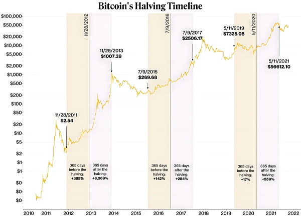在减半前后,比特币价格常常波动。减半前的预期通常会推动价格上涨,而减半后,比特币往往会迎来牛市。在减半前,市场通常会经历约1.3年的熊市,然后用大约1.3年达到峰值,总共需要约2.6年。减半前约有477天是价格触底的时间,而从减半到牛市顶峰,平均需要480天。