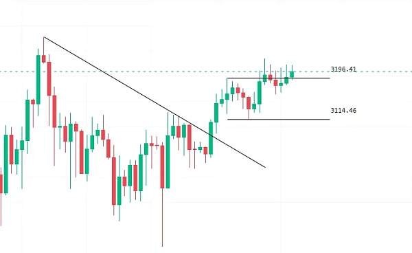 以太坊再次突破3000美元里程碑,这使得围绕第二大加密货币的情绪重新转为看涨。此次反弹已突破 100 天指数移动平均线 (EMA),这表明看涨情绪可能正在重新回到市场。四小时上高低点逐步上移,价格不断破前高。矩形震荡区内空头缩量回调,多头放量上涨。百分比回撤水平大于100%。四小时K线突破矩形震荡区,但是由于突破的K线实体过短,量能也在缩小,所以可能要震荡一下才能上涨。