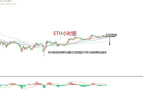 4月23日以太坊(ETH)合约技术面分析:今日方面,大周期日线级别昨日报收小阳线,K线形态连阳上涨,价格在均线上方,附图指标金叉运行,大趋势走势上上涨还是比较明显的,所以主多的思路不变,但不是极强不能直接多,稳健的等回撤再多,同时空单辅助;短周期小时图凌晨价格横盘整理,早间价格支撑小幅上涨,当前承压回撤,K线形态连阴,价格在均线下方,附图指标死叉运行,那么日内还是有下跌需求的,但需要关注欧盘的力度和破位情况,因此今日ETH短线合约交易策略:反抽3200区域空,止损3230区域,目标看3140-3125区域