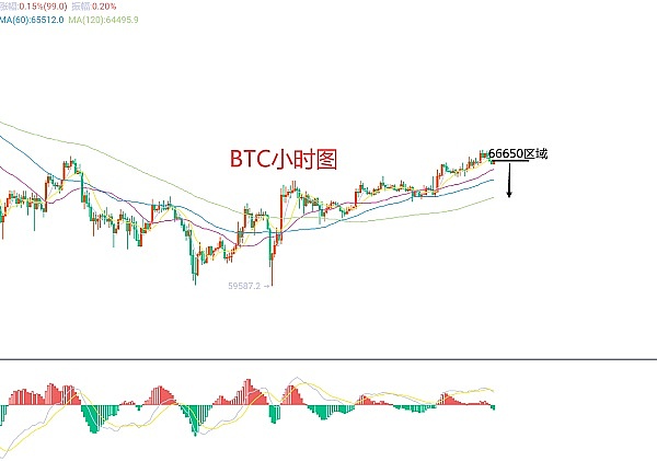 4月23日比特币(BTC)合约技术面分析:今日方面,大周期日线级别昨日报收小阳线,K线形态上连阳上涨,价格在均线上方,附图指标死叉缩量运行,快慢线有粘合金叉迹象,这样来看大趋势上上涨还是比较明显优势的,但还是需要注意消息面和数据的影响;短周期小时图凌晨价格震荡上行,早间承压回撤,高点67250区域附近,当前K线形态连阴下跌,价格在均线下方,附图指标快慢线粘合死叉运行,那么日内大概率还是有下跌需求的,但还是要关注欧盘的强弱和下跌力度,因此今日BTC短线合约交易策略:反抽66650-66700区域空,止损67050区域,目标看66000-65800区域;