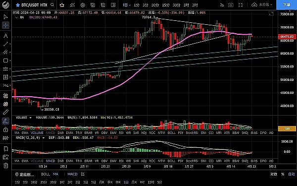 大饼自插针假破前低后一路呈震荡上行走势,昨日白盘行情加速突破65500上方,最高至67230附近受阻回落,恭喜低多的朋友获利七千点,目前币价在66680附近运行,四小时级别ma7拐头向上次穿多跟均线,价格也跟随一路上涨,可见多头走势占优,目前上方触及ma200附近承压,形成双顶回落,关注回踩力度,若守住65500上方则行情会继续上行,日线来看k线六连阳,试探ma60均线压制,空头缩量双线粘合有形成金叉的迹象,目前走势依旧在震荡区间,风险暂时解除,短线多头开始强势,拿好手中筹码继续看好牛市,上方压制67700-68300,下方支撑65500-64500