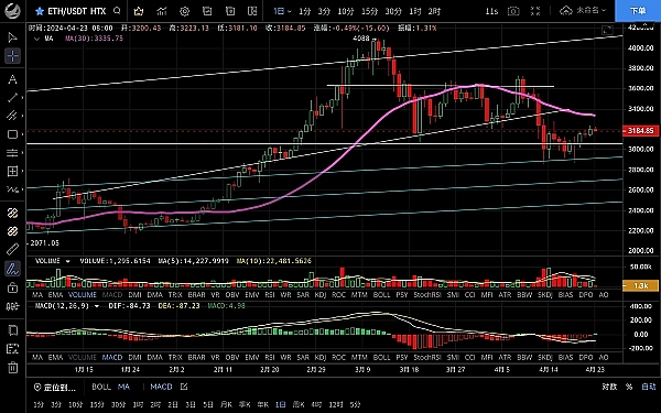 以太坊近期走势与大饼一致,整体呈震荡上行走势,昨日最高触及3235一线受阻回落,恭喜跟上低多思路的朋友获利二百余点,目前币价在3200附近运行,四小时级别多次插针都没有突破可见3230附近承压挺强,多头逐步缩量双线粘合,目前走势有回踩需求,只要守住ma14支撑预计下跌力度不会大,目前以太坊比大饼偏弱,但从盘面来看有加速拉升的可能,日线级别空头缩量双线粘合随时有金叉迹象,预计站稳3230上方后会冲击3320附近,多单继续拿稳,未来涨势一定不错,期待以太坊给我们惊喜,上方压制3230-3320,下方支撑3170-3100