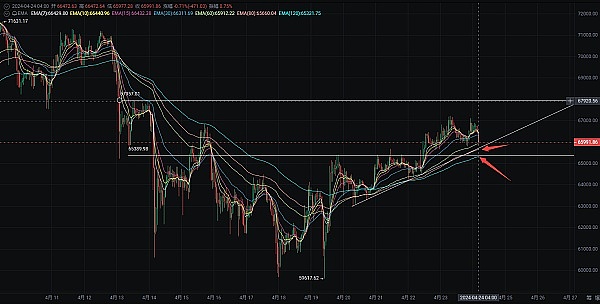 比特币行情从前两日都有低多布局,提到币价也会突破67100,过程走的稍微有点慢,但是很稳!1小时线来看币价一直处于震荡上行,终于突破15日高点,当前币价处于EMA7-EMA15三线节点位置向下运行,MACD中上方能量柱体缩小接近0轴位置,DIF向下DEA形成交叉,KDJ三线拐头向下,表明币价存在回撤现象!