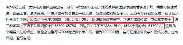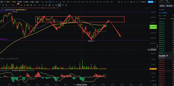 4小时线上看,大饼整体是在高位走持续震荡,下跌也是到前面短线下跌低点,也是短线支撑位置后走出反弹,目前走势上看,大饼现在这个位置是没有很强的压力位的,上放的压力区间在67800-70000,这里是筹码密集区域,反弹后该位置后才会有比较强的压力,在这个区间做空才最合适,短线上,大饼白盘还是有反弹空间的,上放到达67800-70000区间后收长上影线就可做空单布局,白盘交易上,大饼支撑66200附近可以做布局,看到上方压力区间,抓个小短线问题不大,然后见上影线就可开空,70000附近是最佳,自行把握进场机会;短线交易,控制风险,盈亏自理;