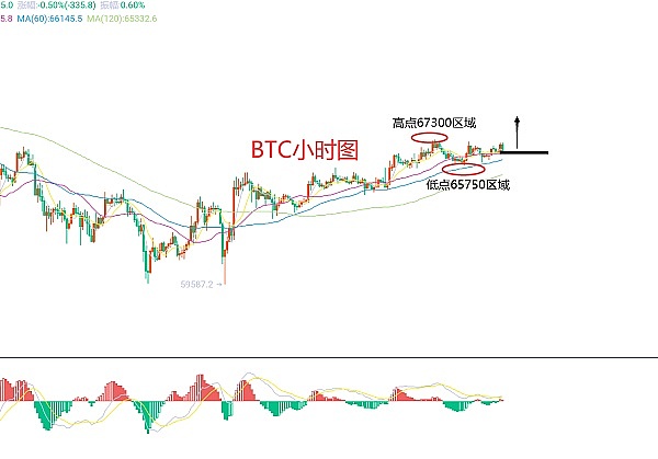 4月24日比特币(BTC)合约技术面分析:今日方面,大周期日线级别昨日报收小阴线,K线形态连阳单阴,价格在均线上方,附图指标金叉运行,大趋势上涨还是比较明显的,只是力度和延续性没有出现较大的参考价值,但思路还是比较清晰的,交易等回撤做多即可;短周期小时图昨日美盘冲高起涨点在65800区域附近,凌晨承压回撤低点在66000区域附近,当前价格在均线上方,K线兴塔连阳单阴,附图指标金叉运行,只是力度还没有出来,但时间不到欧盘,所以不着急;因此今日BTC短线合约交易策略:现价66750区域直接多,止损66350区域,目标看67500-67700区域;