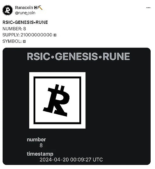 2024年4月20日,Runecoin 发文表示RSIC的符文为第8号符文RSIC•GENESIS•RUNE 。
