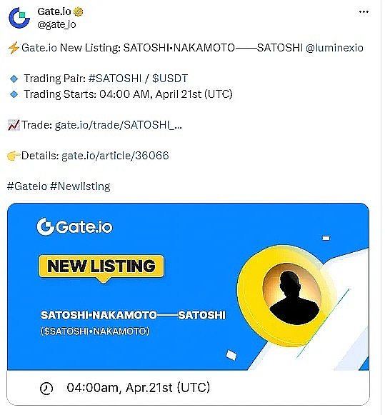 2024年4月20日,Gate.io 发文将于中午 12 点上架 SATOSHI•NAKAMOTO, 交易对为 SATOSHI / $USDT。