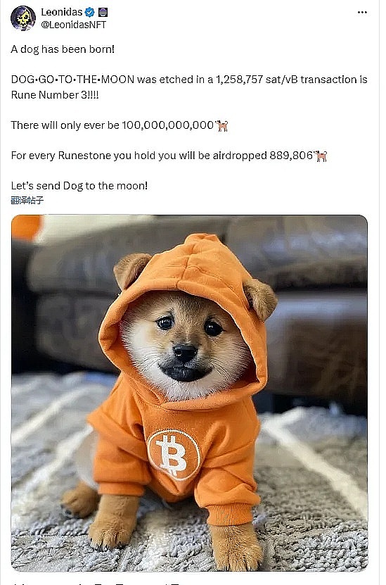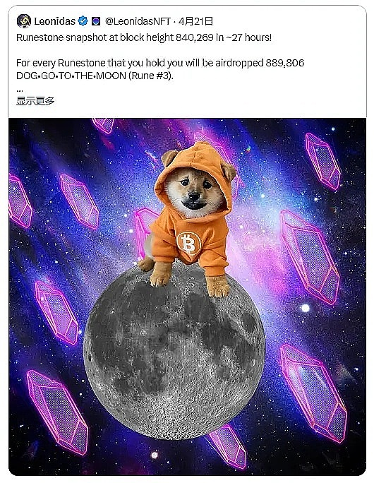 2024年4月20日,Leonidas 发文表示 Runestone 的第一个空投符文代币是第三号符文 DOG•GO•TO•THE•MOON 。