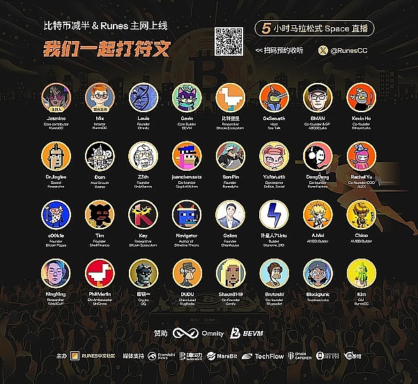 RunesCC,即咱们 Runes 中文社区,在比特币减半之际开启马拉松式 Space,陪着大家一起打符文!我们邀请了比特币生态的 Builder、OG 和 KOL一起分享打符文,我们一起聊: