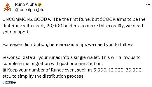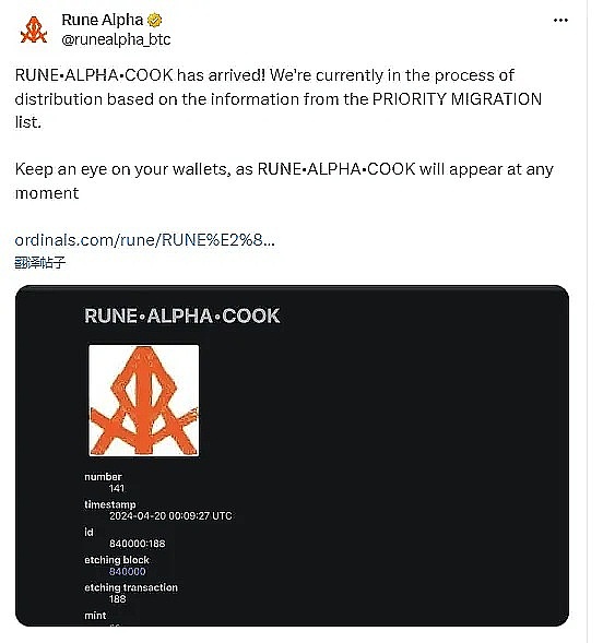 2024年4月15日,Rune Alpha 发文表示首个迁移的 RuneAlpha 符文为 $COOK。
