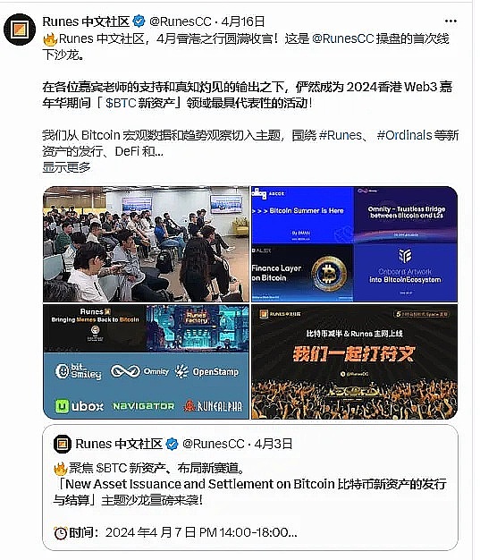 2024年4月16日,Runes 中文社区发文表示 Runes 中文社区,4 月香港之行圆满收官!这是 Runes 中文社区操盘的首次线下沙龙。
