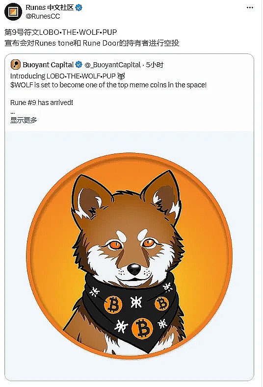 2024年4月20日,Buoyant Capital 发文表示第 9 号符文LOBO•THE•WOLF•PUP 宣布会对 Runestone 和 Rune Door 的持有者进行空投