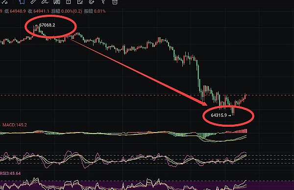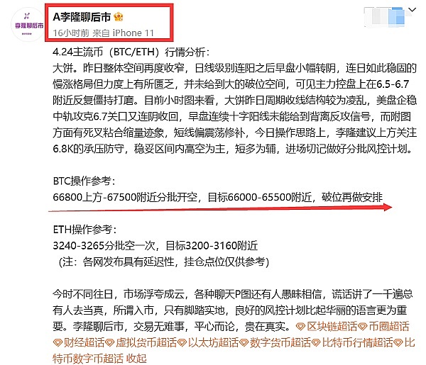 大饼。如李隆早间所说,66800上方直接空,午夜最低跌至64300附近,盘中再次成功扫盈,看空思路竟走出2700点的把握空间,实力番苍,全网见证!点位依旧精准吻合,盘中理性稳健取舍。李隆聊后市,交易无难事,平心而论,贵在真实。