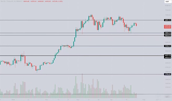 2024年牛市的到来,比特币减半后通常都会有回调,而随着预期之中的减半后回调到来,加密市场在周三下午走低,比特币经历了快速抛售,短线跌破 64,000 美元。目前比特币和美股一样,最近的市场分歧比较大,多空都有可能性,总体还是要考虑偏多,只要不跌破60000,还是牛市行情。