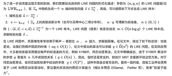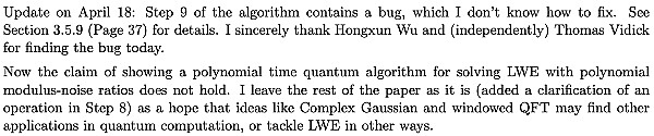 2024 年 4 月 10 日,陈一镭老师在 eprint 上的文章《Quantum Algorithms for Lattice Problems》[12] 引起了学术界的轰动。论文中给出了一种多项式时间求解格上困难问题的量子算法,该算法对很多基于格困难问题的密码方案有着较大冲击,可导致很多算法不再具备抗量子计算机攻击的能力,例如,目前广泛使用的基于 LWE 假设的同态加密算法。论文中算法的正确性暂未可知。