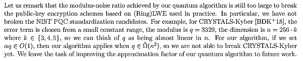 按照论文中给出的结果:仍无法攻破此前 NIST 给出的标准化算法 Kyber, Dilithium,但 NIST 可能会重新评估这些算法的参数。