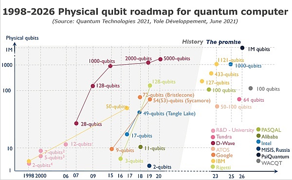 量子计算 [2] 作为利用量子力学调控量子信息单元进行计算的新型计算模式,在 20 世纪 80 年代被提出,在其概念提出后的十年内,量子计算机也只是停留在抽象理论阶段。直到 20 世纪 90 年代中期的两个量子算法:Shor 算法 [3](多项式时间内解决大数分解及离散对数困难问题)和Grover算法 [4](针对非结构化数据的穷举搜索问题提供平方加速)的提出,使得量子计算跳出抽象理论阶段,转而进入到物理载体研发的新阶段,也就是目前所说的量子计算机。下图展示了从 1998 年到 2026 年量子计算机的物理量子比特发展路线图: