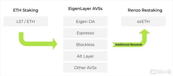 保护 AVS:Renzo 在 EigenLayer 上确保主动验证服务(AVS)的安全,允许用户押注 ETH 并确保这些服务的安全,从而在传统押注奖励之外获得额外奖励。