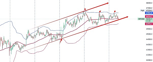 当前BTC在一个上涨通道内盘整。66900是当前最大压力,目前已冲锋三次,但均被空头打下,此处为当前最大压力。日内短线上,有顶背离迹象,超短要小心日内的下杀。