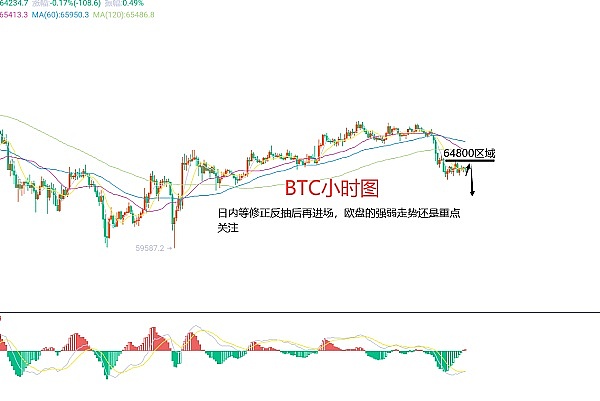 4月25日比特币(BTC)合约技术面分析:今日方面,大周期日线级别昨日报收小阴线,K线形态出现连阴下跌信号,价格在均线下方,附图指标死叉运行,但快慢线走平,高点67600区域,前期起涨点59500区域,这是当前我们需要关注的区间高低点,趋势出现变化那么点位也会随之破位;短周期小时图昨日欧盘价格承压下跌,美盘延续向下破位前一日低点位置,凌晨以及今日早间横盘整理,这样来看,今日要看延续下跌的话,那么反抽力度就不能大了,早间高点在64800区域附近,因此今日BTC短线合约交易策略:反抽64800区域空,止损65200区域,目标看64000-63800区域;