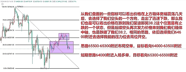 从我们盘面的一些指标可以看出价格在上方箱体宽幅震荡几天后,去选择了我们空头的一个方向,走出了迅速下跌,那么我们也是可以看出价格在跌到我们斐波那契38.2这个位置是有止跌的一个状态,但是后续空头再次发力价格来到我们我们箱体中轴,也是跌破了我们38.2,相同的思路,依日选择我们64600附近去选择我能的压力位去高位开空。