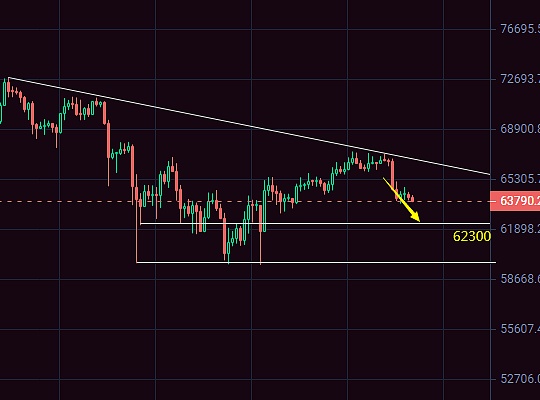第一,以67200作为承压点发起第二轮回调,这种情况一旦成立,那后续行情就必要破前低59600一线支撑。