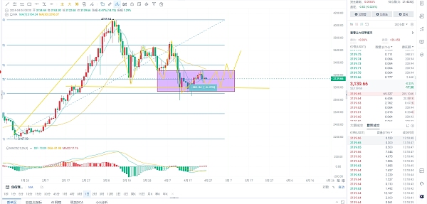 以太坊在近期拉升至最高点位3293附近这个阻力位之后,受到了比特币的影响直线下跌,跌至最低点3070,跌幅超过6%,在今天凌晨,孙总,V神这些大佬持仓之后,比特币以太坊引来了一波反转以太坊刚好拉升反弹至MA30均线这个压力位,目前虽然大盘比较弱势,但是加密货币市场有越来越多的人加入进来,市值也在不断的推高,老王还是直播间说的那句话,以太坊未来可期,回踩我就会分批定投,目前多单还是依旧在手中拿着,一点都不慌,只要它敢跌我就敢买,以及补仓,反弹之后就减仓,合约操作建议的话,低多为主,下方关注3000这个关键位置