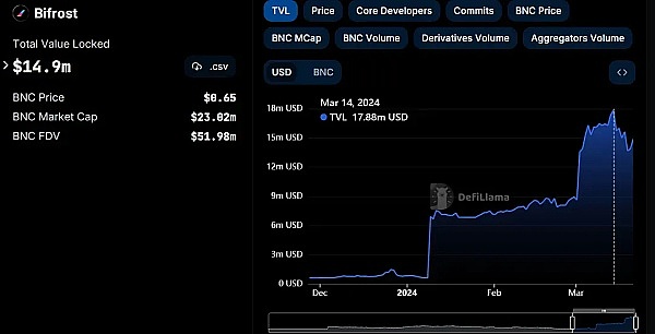 以 DeFi 项目 Bifrost 为例,该项目致力于为质押资产提供流动性。根据其最新的年度报告,Bifrost 的 TVL 在 2023 年实现了显著增长,从 4350 万美元增加到 1.1 亿美元,增长率超过 150%。DeFillama 的最新数据显示,Bifrost 的 TVL 今年已经经历了爆炸性的增长,并在 3 月 14 日达到历史新高。