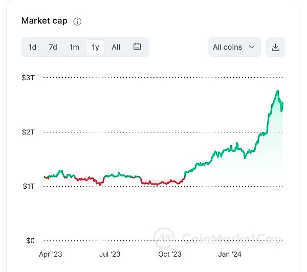 无论是当前火热的 DeFi 和 GameFi 领域,还是最近流行的 AI 与 DePIN 叙事,各领域均呈现出蓬勃的发展势态。根据 CoinMarketCap 的数据,仅从今年 1 月至今短短三个月内,加密资产的总市值便已增长超过 50%。