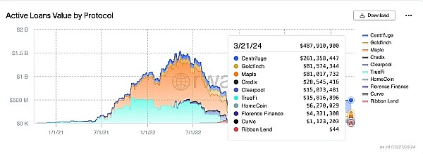 根据 RWA.xyz 的数据显示,Centrifuge 目前的活跃贷款额超过 2.6 亿美元,位居行业首位,并已与早期的 DeFi 协议如 MakerDAO 和 Aave 建立了合作关系。