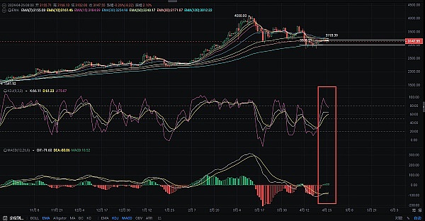 再看日线级别币价受压于EMA7,EMA10,EMA15,EMA80这四线承压,KDJ值中J值正在向下走出超买区,正在向下形成交叉,MACD上方能量持续走弱,DIF与DEA在负值状态间距明显是拉不开的,短期目标继续EMA120处支撑,