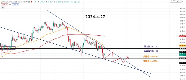 日内第一支撑62550,第二支撑62000。如果短期的价格跌破了第一支撑,那么就会打开下降通道至62000的空间。不过我们可以把第一支撑作为一个重要的支撑点位,也就是可以在此区间寻找反弹做多的机会。