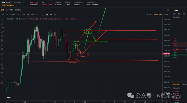 BTC目前阶段的行情走势看日线级别是跌出目前的上行通道,但是在日线级别上走一个高位的区间震荡,按照现在的行情走势来看只要60000的重点关口不跌破的情况,那么山寨在前期进行的一波血洗也不会有什么大跌的行情,也跌不动,对于BTC目前的价格按照我的建议就是不建议进,可以看,如果说大饼二饼的选择,那么选择上我倾向于ETH的布局,现在虽然说BTC震荡,同时后续的行情也是看涨,但是并不代表现在进场有一定的性价比,前期1万多的时候,三万多的时候,四万多的时候你都不进,现在去进,风险和收益并不能成为正比,所以不建议,在目前的日线级别和四小时级别上来看,62000点也是目前的一个短线级别的支撑点位,这个位置最近可以关注下,如果不跌破的情况下是不会再次触及60000的关口,但是一旦跌破的情况下再次去触及60000的支撑,那么这个六万的节点位置并不一定能成功的防守住,现在的行情阶段,那么我们主要的就是等待行情后续走出一个上行阶段的走势,阶段性的走势上方还是要关注下66000的突破,去到68000-72000的位置形成目前走势的一个上行通道,