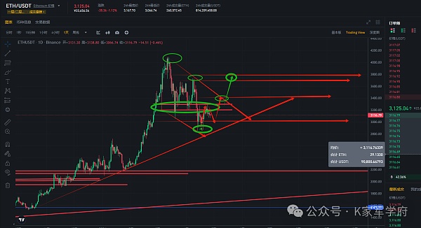 ETH的行情阶段去年到今年实际上按照对比BTC的价格和涨幅来讲是弱势的行情,之前在币圈大家应该都知道,大饼的涨幅是低于二饼涨幅一倍左右才是正确的,所以说大饼涨幅破位历史新高,其实按照现在的二饼的价格今年应该是达到6000以上才是对的,但是并没有,所以二饼也是一个弱势的阶段,也可以说现在的行情是一个假牛的走势,因为整体市场的二饼和山寨都没有进行整体的爆发,我们也是在等这个阶段的爆发,按照目前ETH的走势来看,日线级别是一个下行通道,但是日线级别触及第三个点2800点的边点防守之后进行的反弹,那么行情走势应该是一个反转的行情,反弹到我们的第一步阶段走势3300点的前期支撑,现在的阻力点位就开始回调,目前的回调力度也不是很大,这轮行情ETH就并没有什么涨幅,所以就算后续跌也跌不到哪去,按照整体的对比,所以我在强调的就是ETH的后续空间是大于BTC的空间值,而且风险是小于BTC的风险,所以我建议入手ETH,按照目前的走势上面来看3000的短线级别防守最好就是做一个后续打开下行通道的第二个低点位置,第一步就是先破位3400-3500区间的边点防守位置,后续的走势再去3800点的关键节点位置,这样才能打开上方的空间通道,打破今年的新高行情去到4200-4500区间一线,也只有这样山寨的行情才能得到一大步的回温并进行突破